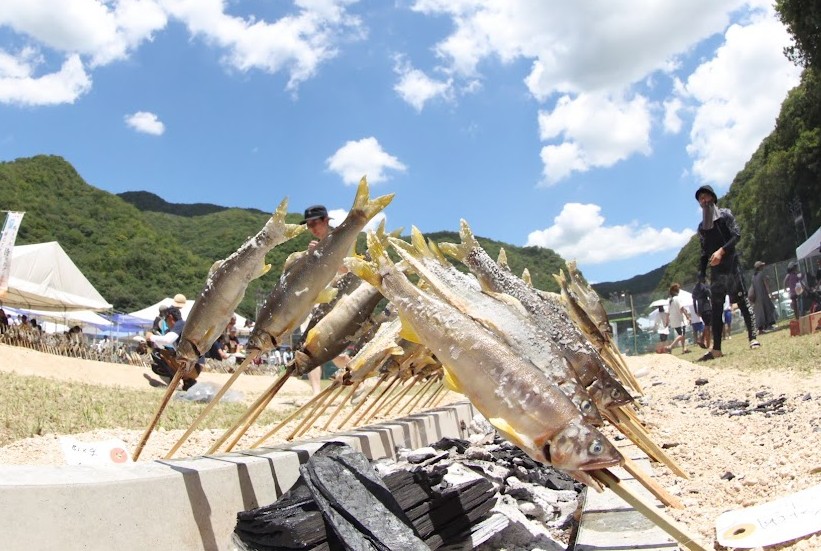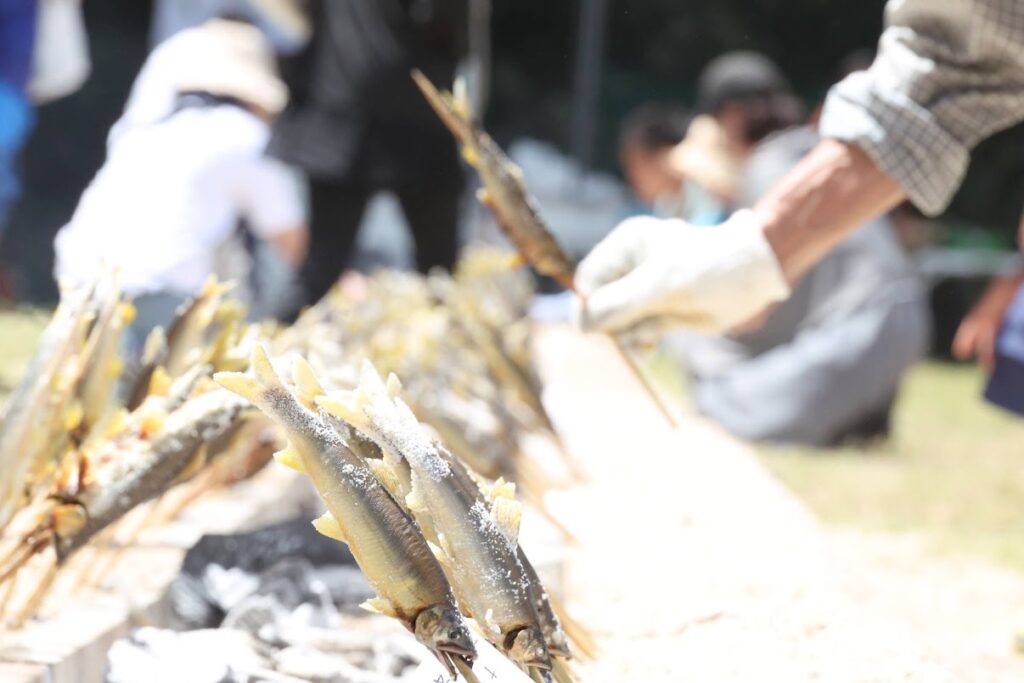 つかまえた鮎は、その場で炭火焼きにして食べることができます。ふっくらと香ばしい鮎ならではの味を楽しんでいただきました。