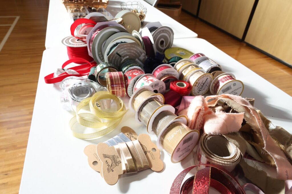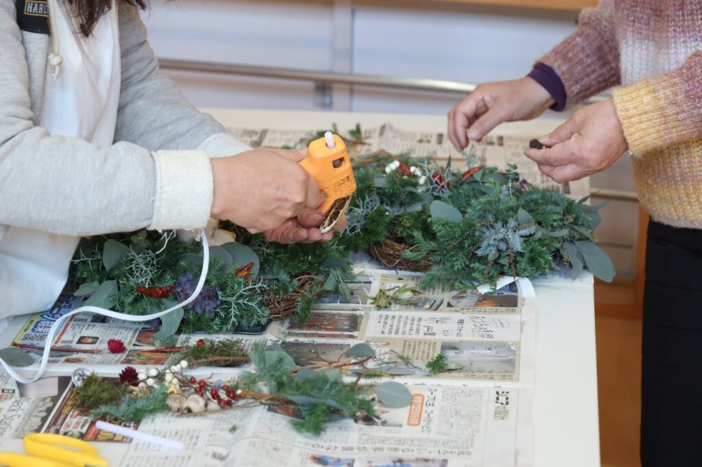 リースの形が整った後は、石川先生にご準備いただいた色とりどりのオーナメントやリボンの中から好みのものを選び、思い思いに装飾をしていきます。
