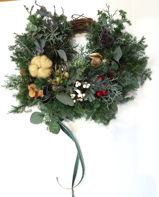 材料には、針葉樹(ブルーアイス、サツマ杉 他)、ユーカリ(ポポラス 他)、ミモザ(赤葉)など、オシャレな雰囲気を演出してくれる自然素材を使用しました。
