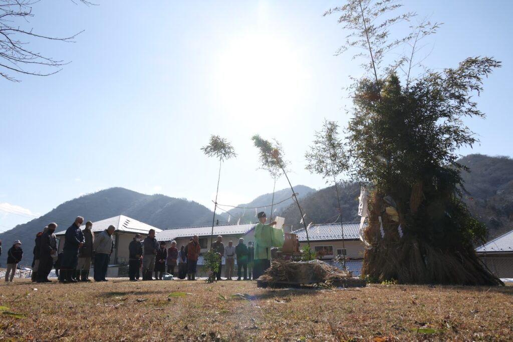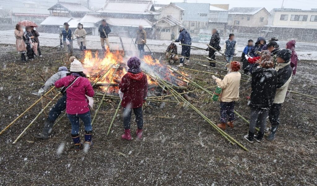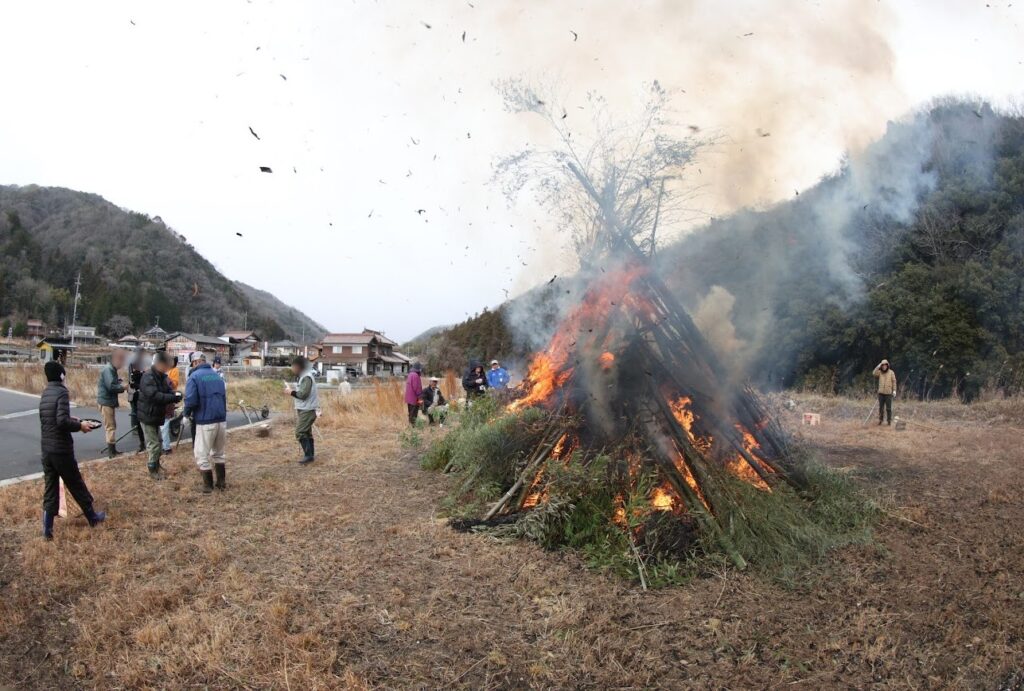 地域のみんなで竹を組み、しめ縄や門松などの正月飾りを入れて燃やします。
